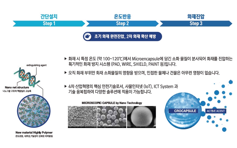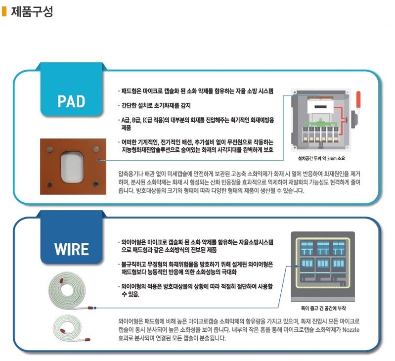| 무전원 자동감지 시스템, 유지관리가 필요없는 오동작율0% 시스템, 간편한 설치, 친환경제품, 화재예방 초기화재진압제품 입니다. | |